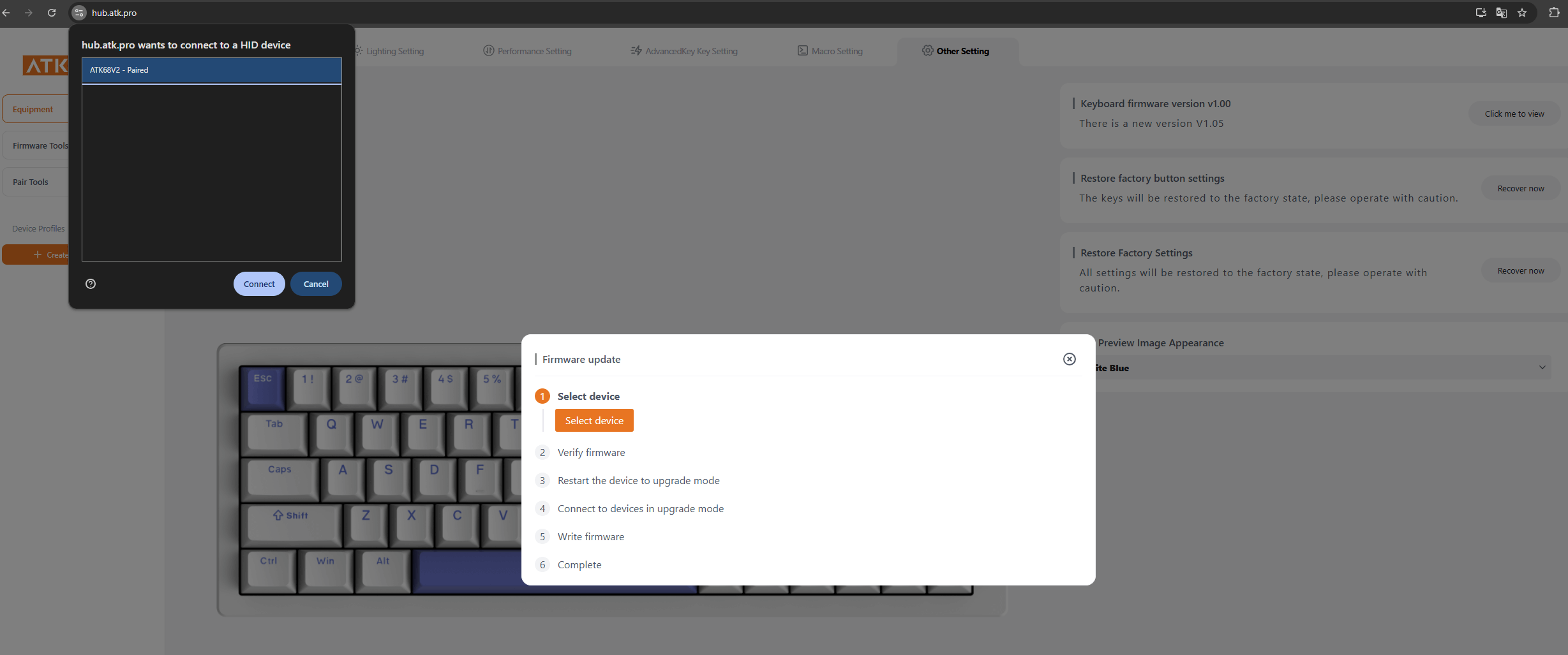 Sau đó, ấn chọn vào biểu tượng bàn phím mà anh em sử dụng, hiện tại mình đang dùng chiếc ATK 68 v2 Pro nên sẽ ấn vào hình bàn phím của mình trên app