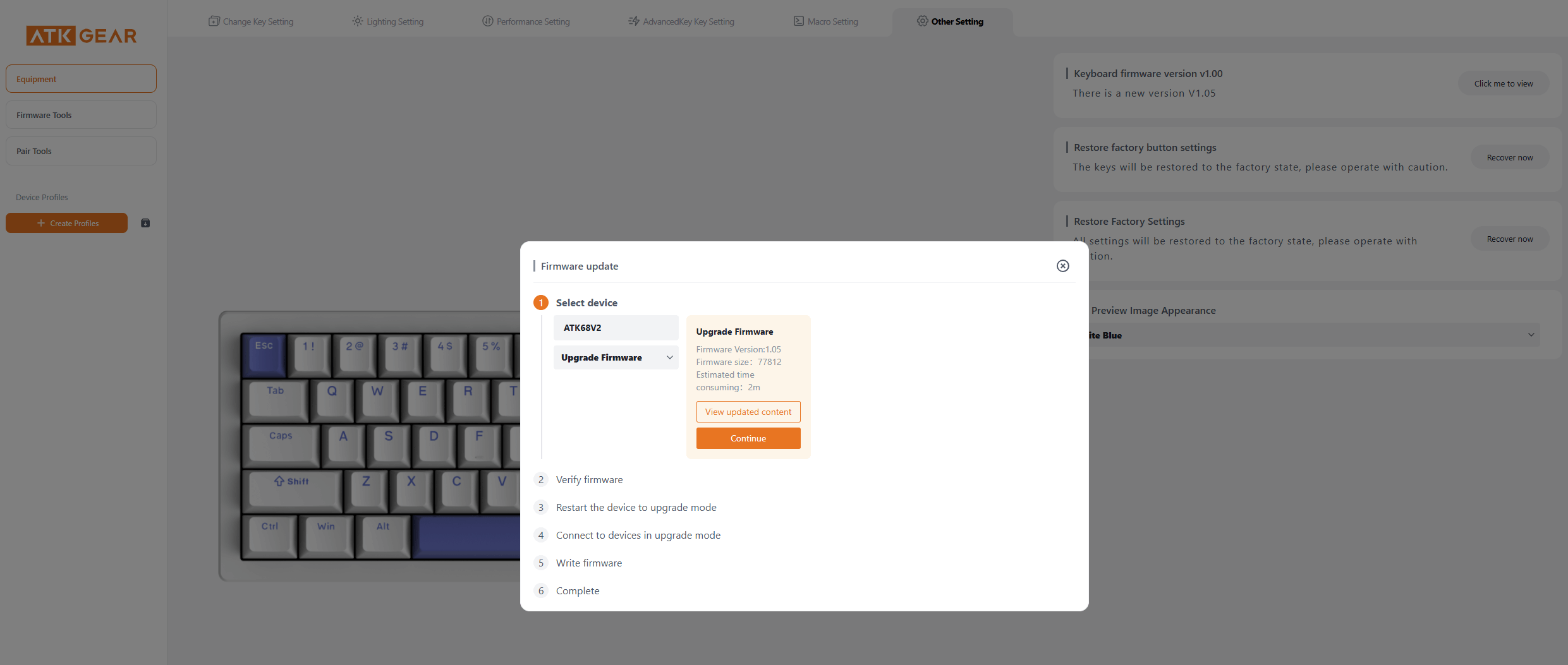 Trước hết, chọn Tab Other Settings phía trên để kiểm tra xem phím đã được cập nhật lên bản Firmware mới nhất chưa, nếu như app hiện "There is a new version..." thì nghĩa là bàn phím cần được cập nhật lên phiên bản mới